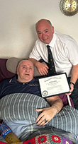 The Provincial Grand Master Brother Irving accompanied the Master Brother Callum Gray of Lodge Kilsyth St John No 39 to the home of Brother William Haggart long term Almoner of the lodge for the presentation of his Jubilee Certificate. Brother Irving was delighted to visit an old friend. |
