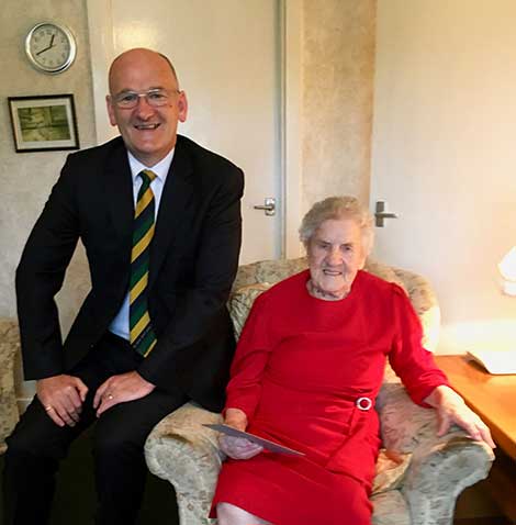 The Master of Lodge St Patrick, Old Kilpatrick, No. 1309, Brother David Donaldson recently had the honour of visiting Mrs Jean Allan, widow of the late Brother Robert Allan, of Lodge St Patrick. The cause for celebrating was Mrs Allan's 100th Birthday, who recently had much pleasure in attending a reception held in her honour celebrating her birthday. On that momentous occasion The Provost of West Dunbartonshire presented Mrs Allan with a Birthday card and message from Her Majesty the Queen.