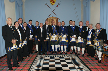 Pictured below are the PGM and his Commissioned Office Bearers with the Master of Lodge St Modan Bro. Philip Teese and a collective photograph of the Brethren of St Modan enjoying the occasion.