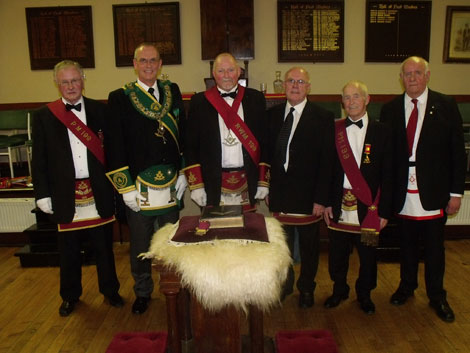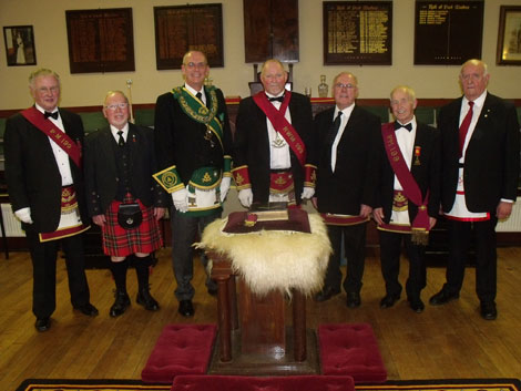 The members concerned were Robert Moffat, Archibald McWatt, William Meechan and David Boyle. A brief history relative to each brother was given by the Right Worshipful Master Bro Sandy Cowie before he and the Provincial Grand Master presented the brethren with their diplomas. Bro Meechan on behalf of his colleagues thanked all concerned for the presentation.