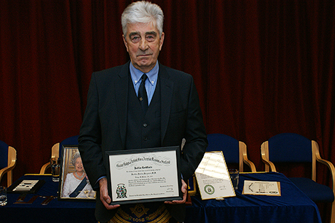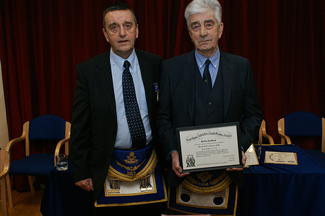 At the regular meeting of Lodge St Modan 1015 on 21st January,2016,Bro Forbes Ferguson was presented to the assembled brethren. Thereafter the R.W.M. Bro Gordon Niven outlined the service given not only to the craft but also to the community by Bro Ferguson in recognition of which he had previously been awarded the M.B.E.