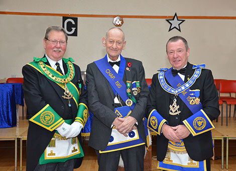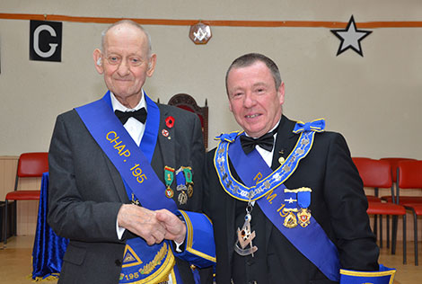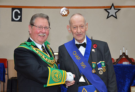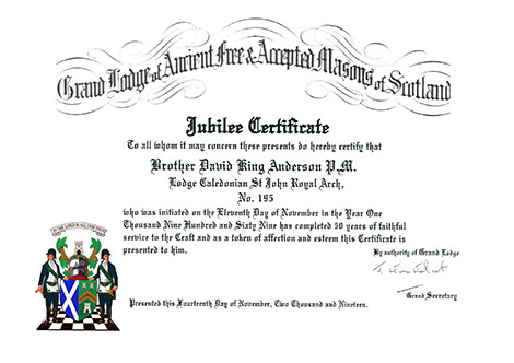 On Thursday,14th November 2019 a Deputation from the Provincial Grand Lodge of Dunbartonshire headed by the Provincial Grand Master Bro James Forrest attended Lodge Caledonian St John Royal Arch No 195 .On this occasion Bro David King Anderson P.M. was presented with a 50 year Jubilee Certificate by the Master Bro David J.W.Pendreigh who outlined Bro Andersons extensive service to the Lodge.