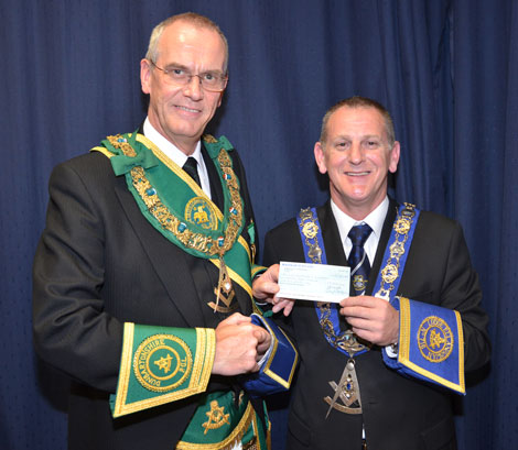 The Provincial Grand Master, Bro. John R. McCormack, was very pleased to attend the Lodge to be presented with a cheque by the Master, Bro. Kenneth Downie, for the magnificent sum of £1705. The picture shows the Provincial Grand Master receiving the cheque from the Master, |