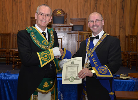 On Wednesday 21st May 2014, Lodge Barrhill No 1444 held a regular meeting within The Masonic Temple, Kilsyth. A deputation from the Provincial Grand Lodge of Dunbartonshire headed by The Provincial Grand Master Bro John. R. McCormack was in attendance to see a 2nd Degree be carried out by Lodge Kyle Kildrum No 1602.