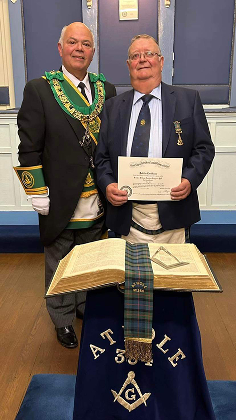 Brother William Douglas Hopgood PM was presented with his 50 Year Jubilee Certificate by the Master of the Lodge, many happy moments of Brother Hopgoods Masonic Career were recounted.